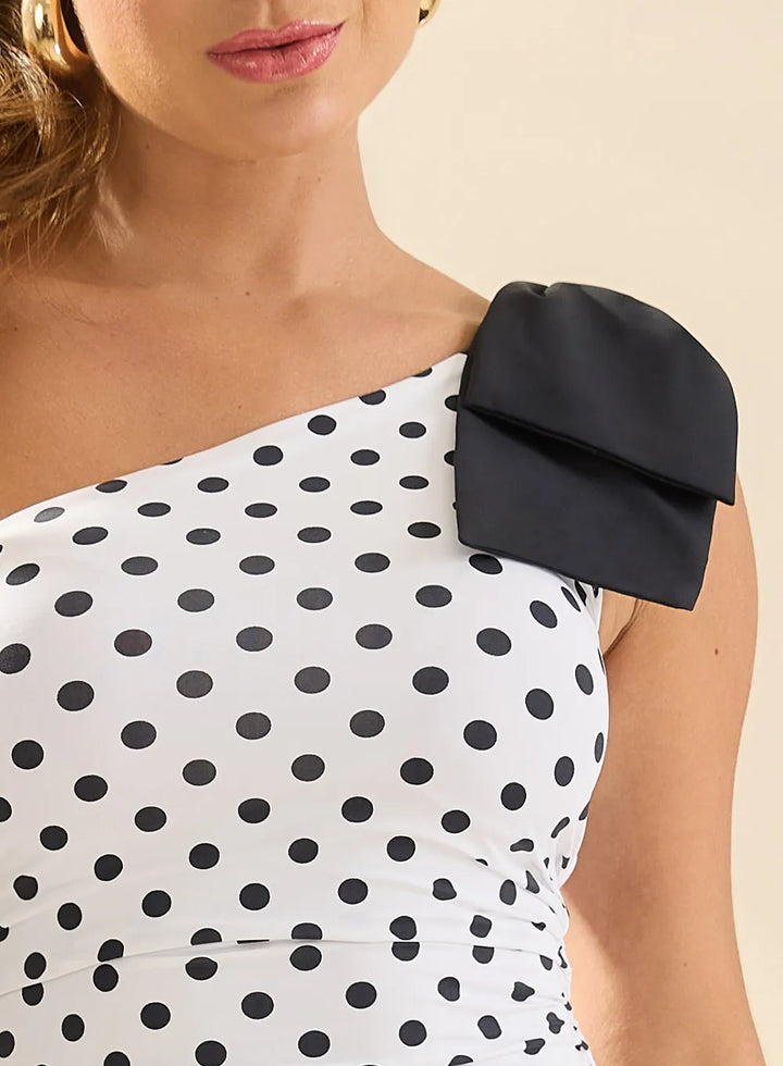 O Body Charlotte traz o charme retrô em estampa poá clássica, com decote assimétrico e bojo que valoriza as curvas de forma sofisticada.