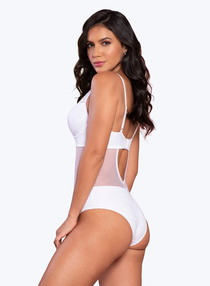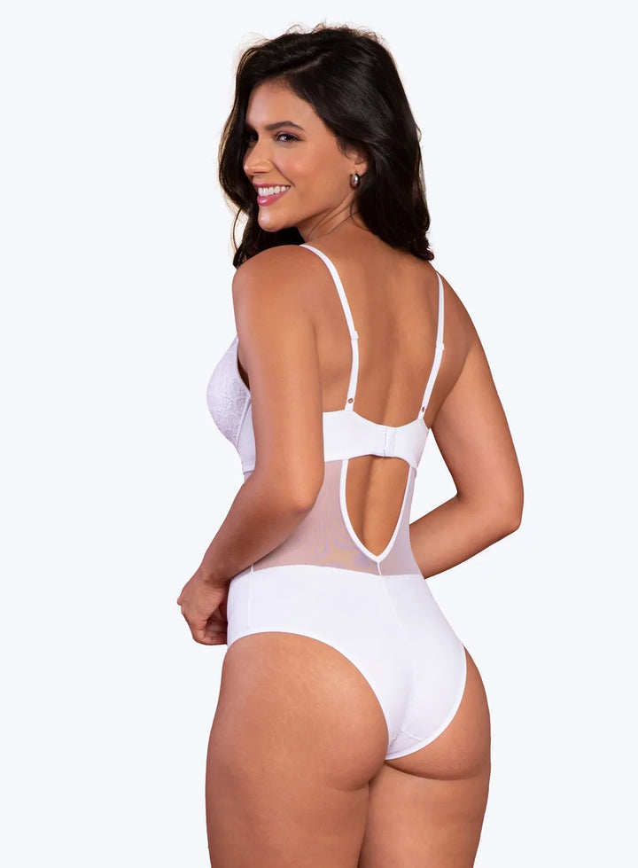 Com frente fullcoverage, laterais duplas e tule forrado em V, o Body Donatella branco combina sensualidade e conforto, destacando curvas de forma elegante.