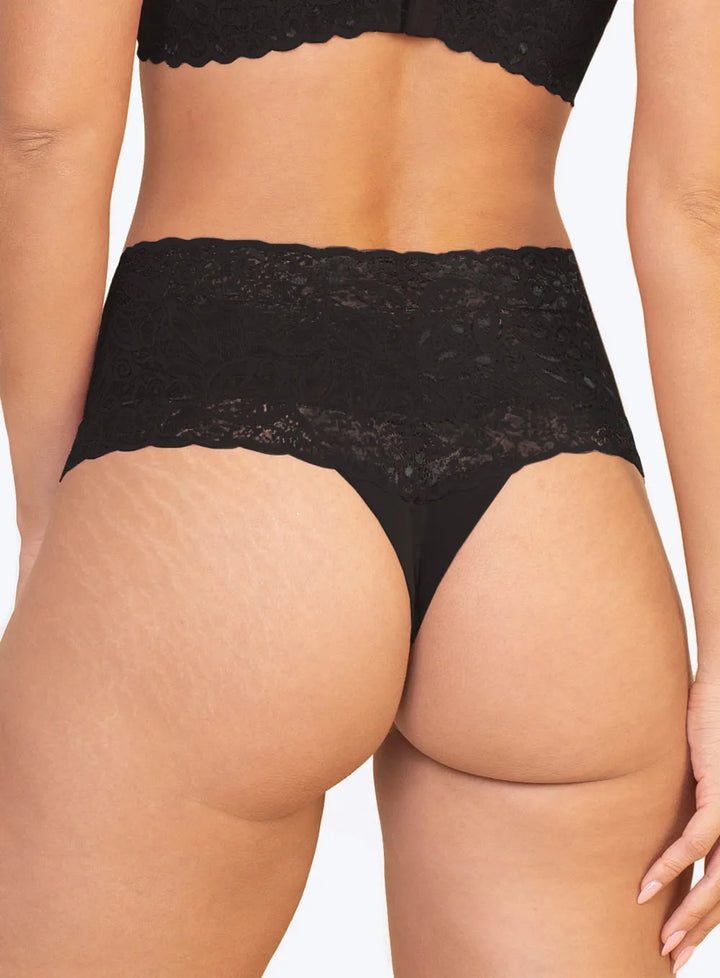 A Calcinha Anyday Preta no modelo fio com cintura alta possui cós em renda e faixa interna com média compressão, garantindo ajuste perfeito e conforto ao longo do dia.