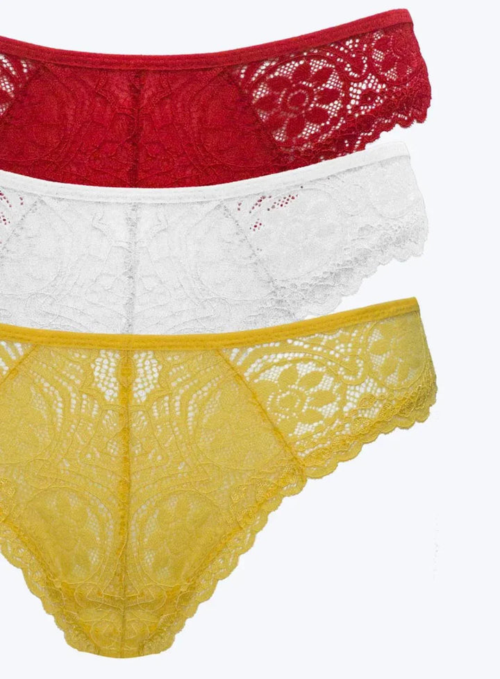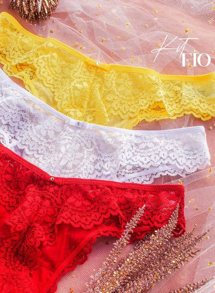 O Kit de Calcinhas Fio em Renda Florescer da Extasis é a escolha ideal para quem busca unir sensualidade e praticidade em um único conjunto. Com modelagem fio dental em renda delicada, as peças foram desenvolvidas para valorizar suas curvas sem abrir mão do conforto. O kit contém 3 calcinhas exclusivas nas cores Amarelo, Vermelho Beijo e Branco, todas com detalhe em laço e cristal na parte de trás, que garantem um toque sofisticado e feminino. Confeccionadas em tecido de alta qualidade, as calcinhas oferecem caimento perfeito, leveza e bem-estar no dia a dia ou em momentos especiais.