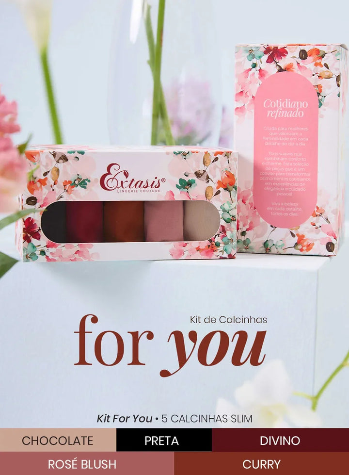 O Kit de Calcinhas For You foi desenvolvido para a rotina prática das nossas mulheres, que valoriza conforto sem abrir mão do estilo. Composto por cinco calcinhas de modelagem slim, o kit reúne tons que vão dos mais românticos aos clássicos, trazendo versatilidade e charme para o dia a dia. Disponível em duas versões, é perfeito tanto para renovar sua gaveta de básicos quanto para presentear alguém especial, com a delicadeza e qualidade que só a Extasis proporciona.