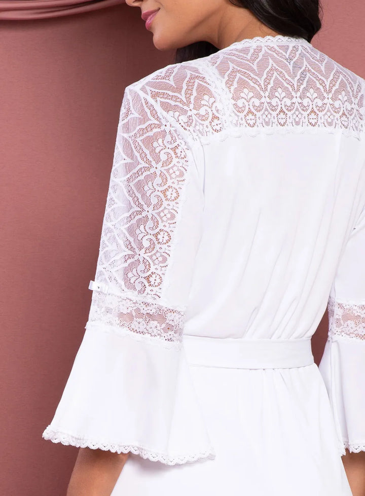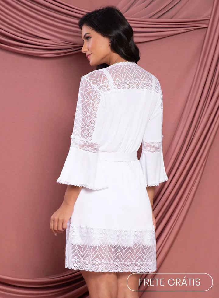 O Robe Donatella branco traz romantismo e feminilidade com renda delicada e transparência suave, proporcionando leveza e conforto nas suas noites.