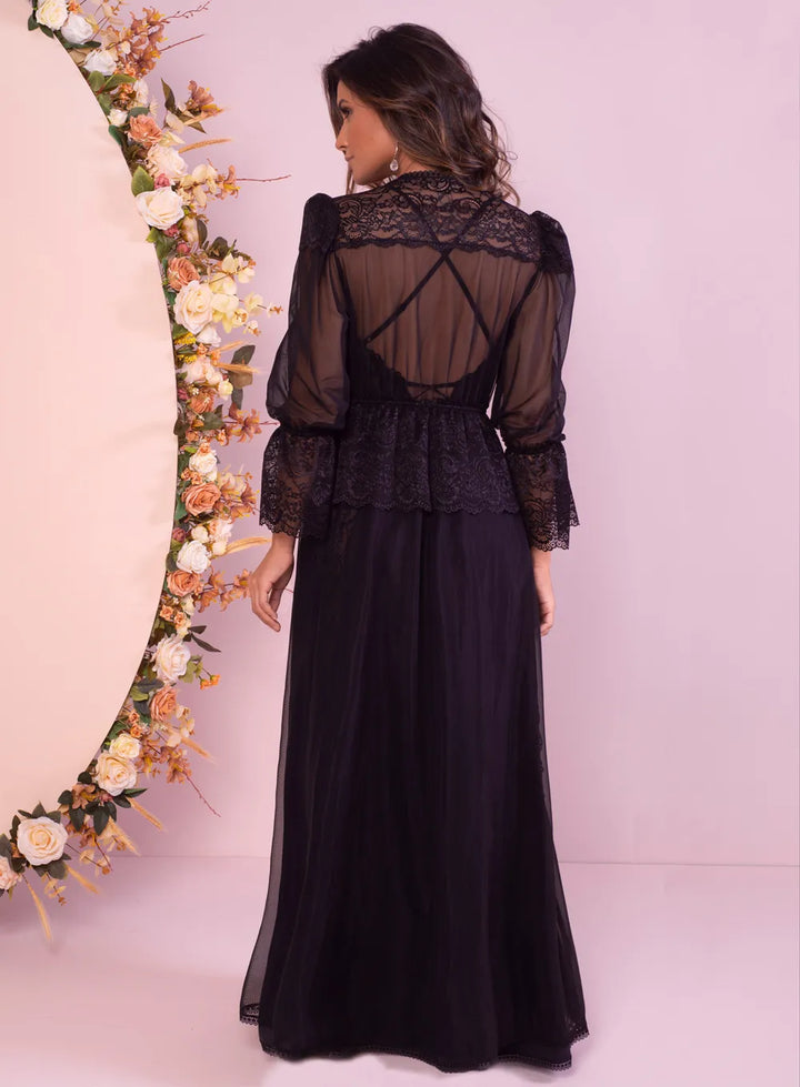 O Robe Catherine é confeccionado em tule e renda com tecnologia francesa. Mangas bufantes com detalhes em renda no ombro e punho criam um visual romântico e feminino. O fecho frontal com fita de cetim adiciona charme e sofisticação.